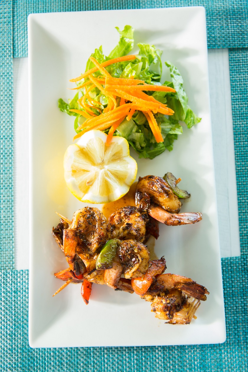 Spicy Jamaican style jerk shrimp served on a bed of organic mix green.